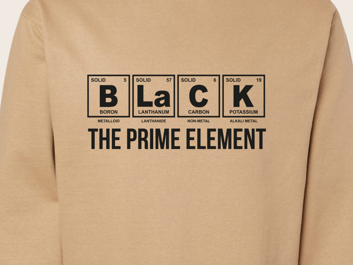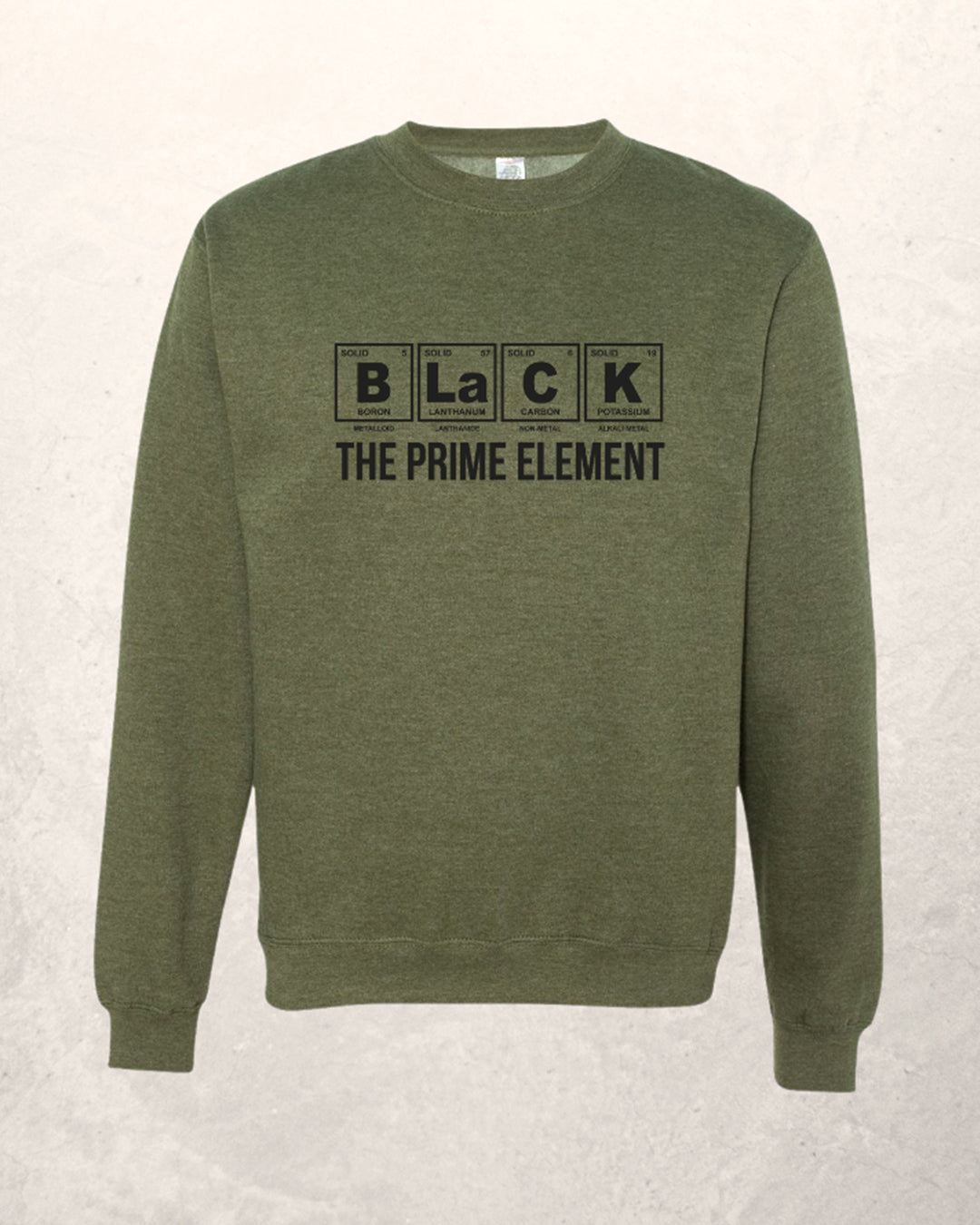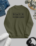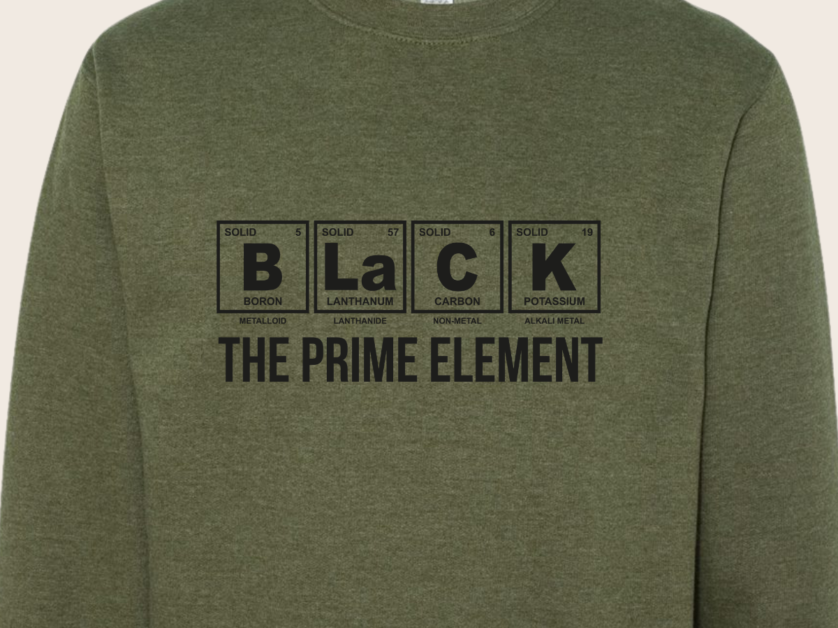 Introduce a touch of science to your style with our "Black the Prime Element" sweatshirt. This unique piece features a clever periodic table-inspired design! Made from a soft and durable blend of premium fabrics, this olive green sweatshirt with a black print is both comfortable and eye-catching. Perfect for casual outings, study sessions, or lounging at home, it's a standout addition to any wardrobe.