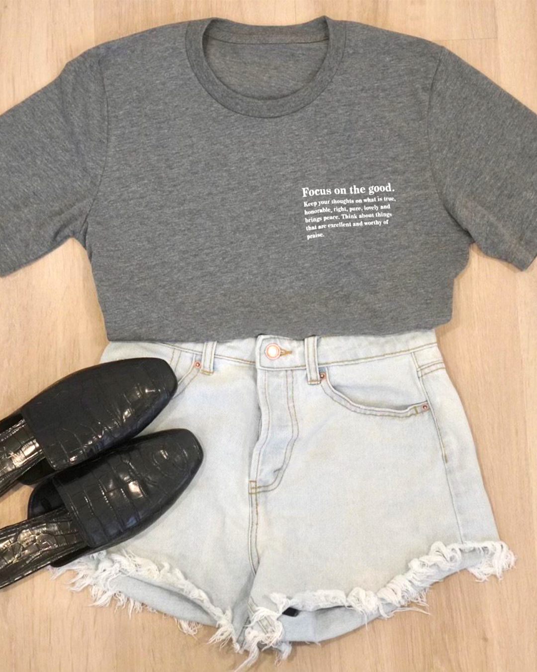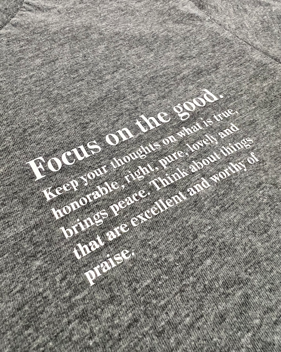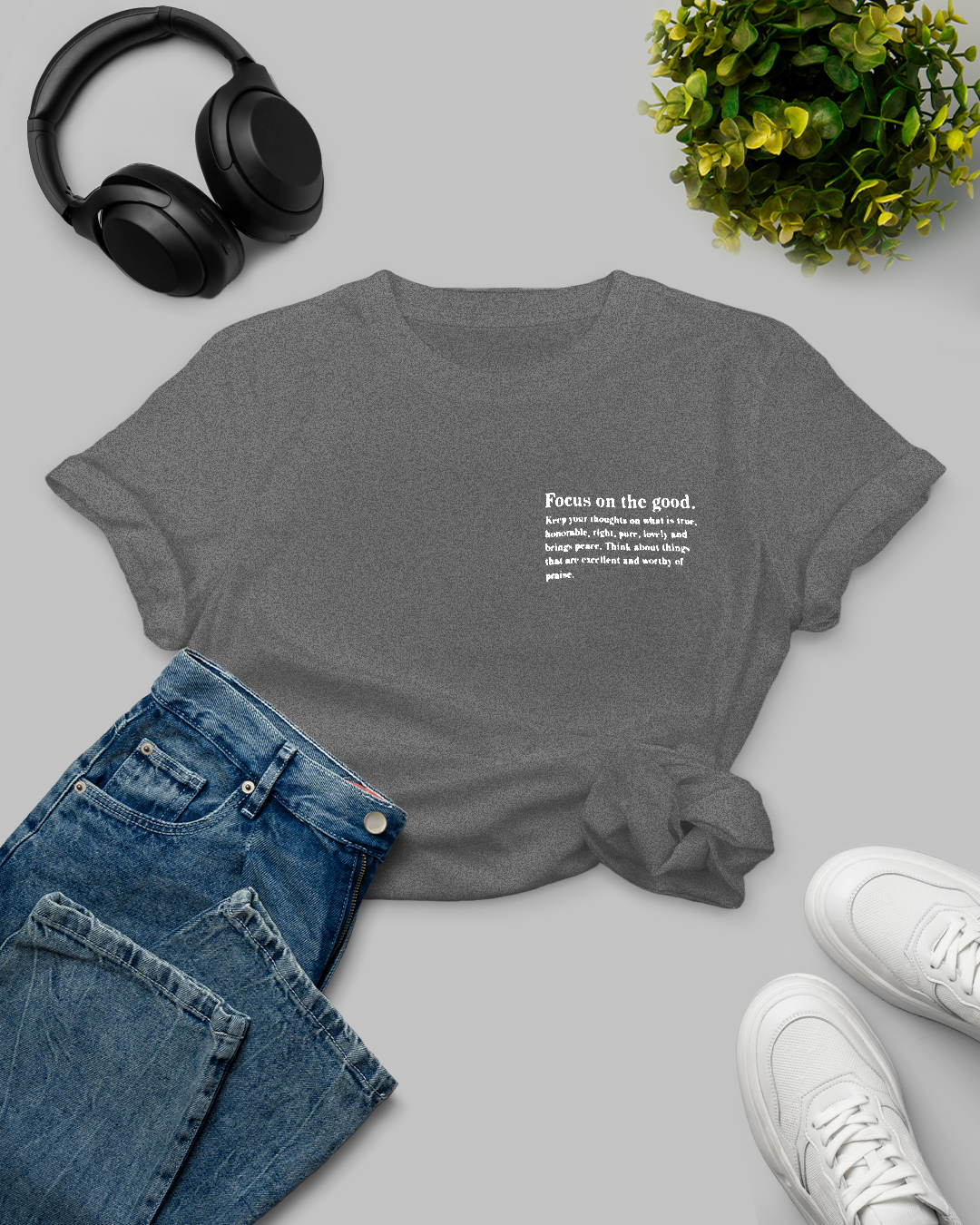 Stay positive with our "Focus on the Good" shirt. Made from a soft, durable fabric blend, this tee offers comfort and quality. Perfect for casual outings or lounging at home, its uplifting message encourages a positive outlook. Add this versatile shirt to your wardrobe and spread positivity wherever you go.