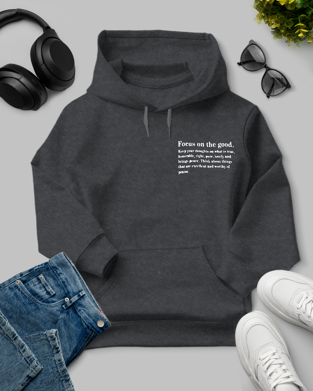 Stay positive and stylish with our "Focus on the Good" sweatshirt. This cozy piece features a simple yet powerful message, reminding you to keep a positive outlook. Crafted from a soft and durable blend of premium fabrics, this sweatshirt offers both comfort and longevity. Its versatile design makes it perfect for casual outings, relaxing at home, or layering on cooler days. Add a touch of optimism to your wardrobe with the "Focus on the Good" sweatshirt.