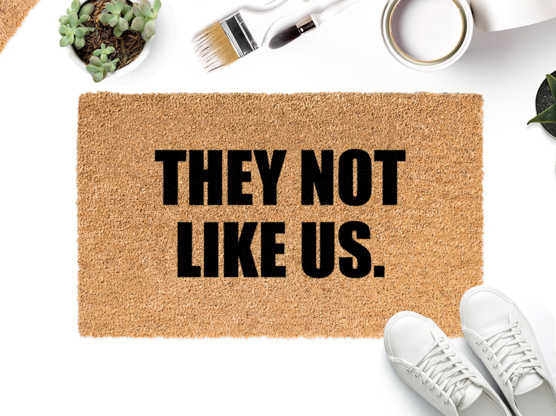 Upgrade your doorstep with our "They Not Like Us" doormat. This doormat celebrates uniqueness and individuality in bold style. It's the perfect statement piece to greet your guests with not just a welcome, but a declaration.